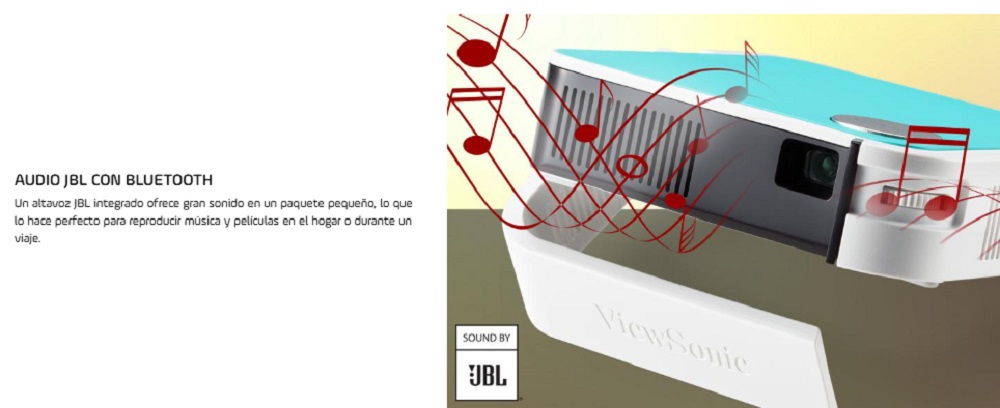 La batería incorporada, el altavoz JBL y la capacidad de carga desde un banco de energía permiten un uso fácil al aire libre o mientras viaja. El soporte ajustable ofrece ángulos de proyección flexibles que pueden satisfacer muchas necesidades de visualización, incluso la proyección en el techo.