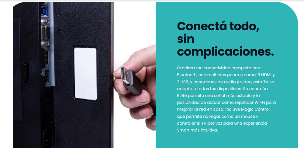 Con el control Magic Remote disfruta de funciones intuitivas como el control por voz, acceso rápido a Netflix, YouTube, Prime Video, Disney+ y un puntero preciso que te permite seleccionar con un simple movimiento. Con su diseño ergonómico y tecnología avanzada, navegá por tus aplicaciones con el simple movimiento de la mano.